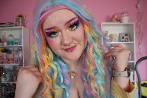 Yesterday's makeup and hair for when I was going to play in Värnamo during the live carousel ~ I took the opportunity to dye my hair beforehand, filled in the rainbow, dyed the side that had previously been red-black, and also dyed a bit of extensions so I could get more color!🌈✨ I used Directions and mixed the purple with cerise and lagoon blue (I've used violet before, but it barely sticks and washes out immediately) It was also international hat day, so I wore a mini hat since a bigger hat felt cumbersome if I had to keep taking it off and on while holding my guitar when I was going to play and sing cx I've been so depressed lately, but I always feel a bit more like myself when I've just dyed my hair, and hopefully, the positive energy from yesterday lasts since I had a blast!💖21 products in post 🌈💖2070 views - The user's roll: Lyko Creator. The post was made 5 months