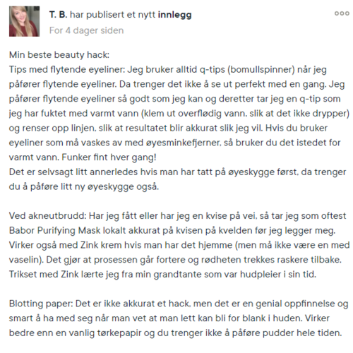 - Innlegget ble opprettet 4 årMin beste beauty hack: Tips med flytende eyeliner: Jeg bruker alltid q-tips (bomullspinner) når jeg påfører flytende eyeliner. Da trenger det ikke å se ut perfekt med en gang. Jeg påfører flytende eyeliner så godt som jeg kan og deretter tar jeg en q-tip som jeg har fuktet med varmt vann (klem ut overflødig vann, slik at det ikke drypper) og renser opp linjen, slik at resultatet blir akkurat slik jeg vil. Hvis du bruker eyeliner som må vaskes av med øyesminkefjerner, så bruker du det istedet for varmt vann. Funker fint hver gang! Det er selvsagt litt annerledes hvis man har tatt på øyeskygge først, da trenger du å påføre litt ny øyeskygge også. Ved akneutbrudd: Har jeg fått eller har jeg en kvise på vei, så tar jeg som oftest Babor Purifying Mask lokalt akkurat på kvisen på kvelden før jeg legger meg. Virker også med Zink krem hvis man har det hjemme (men må ikke være en med vaselin). Det gjør at prosessen går fortere og rødheten trekkes raskere tilbake. Trikset med Zink lærte jeg fra min grandtante som var hudpleier i sin tid. Blotting paper: Det er ikke akkurat et hack, men det er en genial oppfinnelse og smart å ha med seg når man vet at man lett kan bli for blank i huden. Virker bedre enn en vanlig tørkepapir og du trenger ikke å påføre pudder hele tiden. Drikk ellers nok vann, sov nok timer og BRUK SPF! :) #beautyhack2021 #babor142 visninger