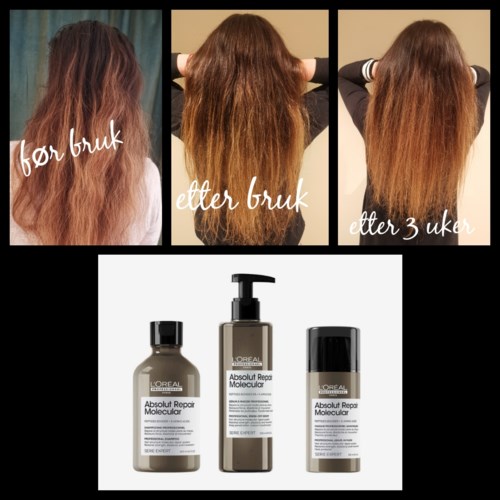 Jag deltar som testpilot via Smartson och har fått gratis provprodukter : L'Oréal Professionnel Absolut Repair Molecular Shampoo 300 ml L'Oréal Professionnel Absolut Repair Molecular Rinse-off Serum 250 ml L'Oréal Professionnel Absolut Repair Molecular Leave-in Mask 100 ml Känsla av en ren hårbotten och håret efter tvätt. Håret är starkare, friskare, glansigare och mjukare. Frisyren håller formen, hårtopparna delar sig inte. Schampot har en tjock konsistens. Bara lite schampo (ungefär i storlek med en ärta) räcker för att tvätta långt hår. Schampot har en härlig orientalisk lyxig doft. Trevlig doft till nästa tvätt. Efter två veckors användning märker jag mindre håravfall. Jag tvättade håret varje dag innan jag använde denna serie, nu räcker det med ungefär var tredje dag. Jag rekommenderar absolut att prova hela serien!1 produkt i inlägget Nöjd!1470 visningar